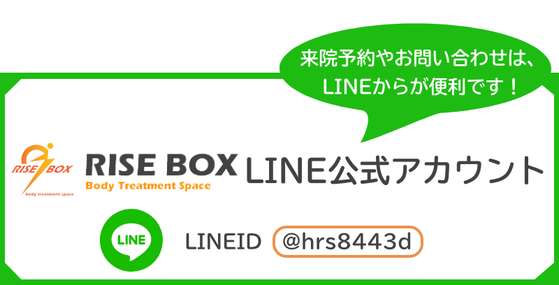![RISE BOX Body Treatment Space 〒474-0025 愛知県大府市中央町6丁目74-1 ランナーの方、ウォーキング・登山を楽しむ方、また足の痛みでお悩みの方、専門家に相談してみませんか? ホームページを見たとお伝えください TEL0562-57-7110 [診療時間]火・水・金 13:00~21:00 土 9:00~12:00 休診日 日・祝 ご予約・お問い合わせはこちら](/wp-content/uploads/homare_2-2.png)